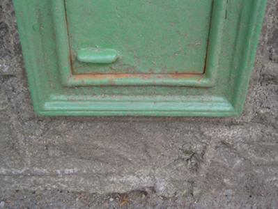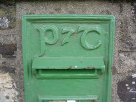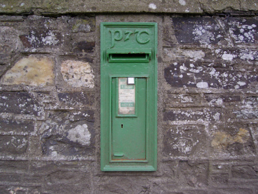 A "wall box" post box supplied by I.V.I. [Industrial Vehicles Ireland] Foundry (fl. 1935-86) of Athy, County Kildare, representing an interesting example of mass-produced cast-iron work making a pleasing, if largely inconspicuous visual statement in a rural street scene with embellishments identifying the artistic potential of the composition including the Cló Gaelach or "Old Irish Lettering" defining the monogram of the Department of Posts and Telegraphs (fl. 1924-84).