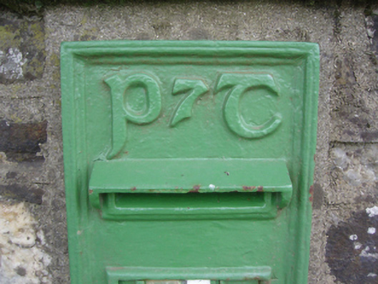 Wall-mounted cast-iron "wall box" post box, between 1939-1984, with "P7T [Posts and Telegraphs]" monogram. Set in tuck pointed coursed rubble stone boundary wall.