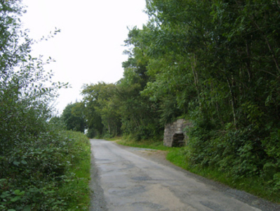 Freestanding single-oven single-stage lime kiln, extant 1798, on a square plan. Now disused. Part repointed coursed rubble granite battered walls with rough hewn granite flush quoins to corners. Single square-headed oven below inscribed cut-granite plaque ("1998") with rough hewn granite lintel. Road fronted on grass verge.