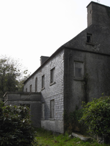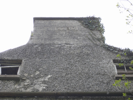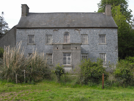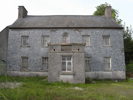 Detached three-bay two-storey farmhouse with dormer attic, dated 1790, on a cruciform plan centred on single-bay single-storey flat-roofed projecting porch to ground floor; single-bay (two-bay deep) two-storey lower central return (north). Occupied, 1901; 1911. Now disused. Pitched slate roof on a T-shaped plan centred on pitched corrugated-iron roof (north), clay ridge tiles, date stone-embossed ("1790") rendered, ruled and lined red brick Running bond chimney stacks having lichen-covered cut-granite shallow capping, concrete or rendered coping to gable (north) with rendered, ruled and lined red brick Running bond chimney stack to apex having cut-granite shallow capping, and cast-iron rainwater goods on red brick header bond stepped eaves retaining cast-iron downpipes. Slate hung wall to front (south) elevation on roughcast base with flat iron serpentine tie bars; roughcast surface finish (remainder). Segmental-headed central door opening into farmhouse with concealed dressings centred on cut-granite keystone framing timber panelled door having fanlight. Square-headed window openings centred on round-headed window opening (first floor) with cut-granite sills, and concealed dressings framing six-over-six (ground floor) or three-over-six (first floor) timber sash windows without horns centred on three-over-six timber sash window having fanlight. Paired square-headed window openings (gables) with cut-granite sills, and concealed dressings framing two-over-two timber sash windows having part exposed sash boxes. Interior including (ground floor): central hall retaining carved timber surrounds to door openings framing timber panelled doors, staircase on a dog leg plan with timber balusters supporting timber banister terminating in turned timber newels, and carved timber surrounds to door openings to landing framing timber panelled doors; dining room (south-west) retaining carved timber surround to door opening framing timber panelled door with timber panelled shutters to window openings, chimneypiece now missing, and plaster ceiling on timber batons; drawing room (south-east) retaining carved timber lugged surround to door opening framing timber panelled door with carved timber lugged surrounds to window openings framing timber panelled shutters on panelled risers, chimneypiece now missing with hearth centred on fluted keystone, and run moulded plasterwork cornice to ceiling; and carved timber surrounds to door openings to remainder framing timber panelled doors with carved timber surrounds to window openings framing timber panelled shutters. Set in unkempt grounds with benchmark-inscribed cut-granite monolithic piers to perimeter supporting flat iron double gates.