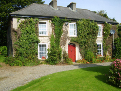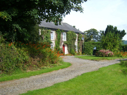 Detached three-bay two-storey farmhouse, extant 1782, on a rectangular plan with single-bay two-storey side elevations. Occupied, 1911. Renovated, ----. Replacement hipped fibre-cement slate roof with clay ridge tiles, paired rendered red brick Running bond central chimney stacks having stepped capping supporting yellow terracotta octagonal pots, and uPVC rainwater goods on eaves boards on slate flagged eaves. Part creeper- or ivy-covered lime rendered or roughcast walls over coursed rubble stone construction with concealed flush quoins to corners; slate hung surface finish to side (south) elevation. Segmental-headed central door opening with cut-granite threshold, and concealed red brick block-and-start surround having concave reveals framing timber panelled door having fanlight. Square-headed window openings with cut-granite sills, and concealed red brick block-and-start surrounds framing replacement six-over-six sash windows having exposed sash boxes. Set in landscaped grounds.