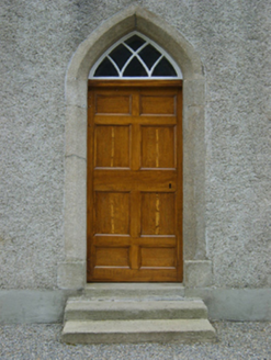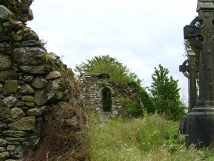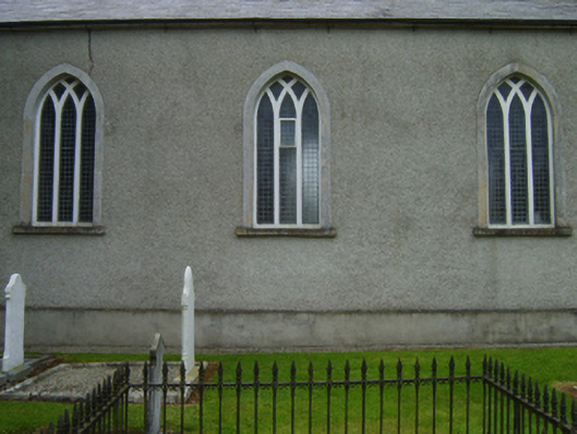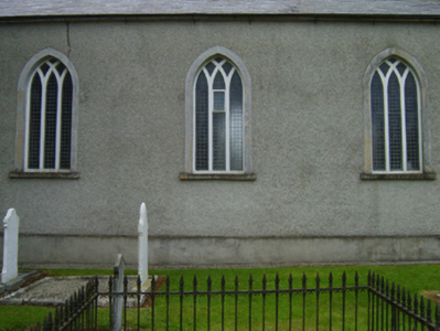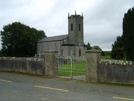 Detached three-bay double-height single-cell Board of First Fruits Church of Ireland church, built 1795, on a rectangular plan with pair of single-bay single-storey vestries centred on single-bay three-stage tower to entrance (west) front on a square plan. "Repaired", 1830, producing present composition. "Restored", 1908-9. Renovated, 1922, with interior "improved". Renovated, 2002. Pitched slate roof with clay ridge tiles, cut-granite coping to gables on rendered kneelers, and cast-iron rainwater goods on cut-granite eaves retaining cast-iron octagonal or ogee hoppers and downpipes. Roughcast walls bellcast over rendered plinth; roughcast surface finish to tower on rendered plinth with cut-granite octagonal pinnacle-topped rendered crow stepped parapets having cut-granite coping. Pointed-arch window openings with cut-granite sills, interlocking timber Y-mullions, and monolithic surrounds framing fixed-pane fittings having stained glass margins centred on square glazing bars. Pointed segmental-headed door opening to entrance (west) front approached by flight of three benchmark-inscribed cut-granite steps, cut-granite surround having chamfered reveals framing timber panelled door having overlight with interlocking V-tracery glazing bars. Square-headed blind openings (second stage) with cut-granite sills, and cut-granite monolithic surrounds framing roughcast infill. Lancet openings (bell stage) with cut-granite sills, and cut-granite monolithic surrounds framing louvered timber fittings. Interior including vestibule (west); full-height interior "restored", 1908-9, with timber panelled pipe organ (west), carpeted central aisle between trefoil-detailed timber pews, timber boarded or tongue-and-groove timber panelled wainscoting supporting carved timber dado rail, and memorial communion railing (1909) centred on altar table below "East Window". Set in landscaped grounds with roughcast piers to perimeter having cut-granite shallow pyramidal capping supporting spear head-detailed wrought iron double gates.