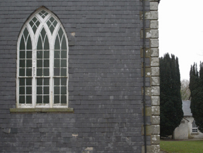 Detached three-bay double-height single-cell Board of First Fruits Church of Ireland church, completed 1817; consecrated 1818, on a rectangular plan with single-bay three-stage tower to entrance (north) front on a square plan. Pitched slate roof with clay ridge tiles, cut-granite coping to gables including moss-covered cut-granite coping to gable (south) on cut-granite diagonal obelisk pinnacle-topped kneelers with cut-granite diagonal obelisk pinnacle to apex, and cast-iron rainwater goods on cut-granite eaves retaining cast-iron octagonal or ogee hoppers and downpipes. Roughcast walls with rusticated cut-granite quoins to corners; slate hung surface finish (south); rendered, ruled and lined surface finish (tower) with rusticated cut-granite quoins (first stage) or granite ashlar piers (upper stages) to corners including "arrow loop"-detailed battlemented piers (bell stage) framing "arrow loop"-detailed crow stepped battlements having cut-granite "saddleback" coping. Pointed-arch window openings with cut-granite sills, timber Y-mullions, and concealed dressings framing six-over-six timber sash windows without horns having Y-tracery glazing bars. Pointed-arch window opening (south) with cut-granite sill, timber interlocking Y-mullions, and concealed dressings framing six-over-six timber sash windows without horns having Y-tracery glazing bars. Lancet blind opening (tower) with cut-granite sill, and concealed dressings framing rendered, ruled and lined infill. Square-headed blind openings (second stage) with cut-granite sills, and concealed dressings with hood mouldings over framing rendered, ruled and lined infill. Lancet openings (bell stage) with cut-granite sills, and concealed dressings with hood mouldings framing louvered fittings. Interior including vestibule (north); pointed-arch door opening into nave with timber panelled double doors having overpanel; full-height interior with carpeted central aisle between quatrefoil-detailed timber pews, carved timber dado rail, cut-white marble Gothic-style wall monument (1854) with polished brass Gothic-style wall monument (1876), quatrefoil-perforated Gothic-style pulpit on an octagonal plan with Gothic-style clerk's desk, carpeted cut-veined white marble stepped dais to chancel (south) with wrought iron-detailed barley-twist balusters supporting carved timber communion railing centred on cloaked altar table below "South Window", and moulded plasterwork cornice to ceiling. Set in landscaped grounds with rendered, ruled and lined piers to perimeter having cut-granite shallow pyramidal capping supporting wrought iron double gates.