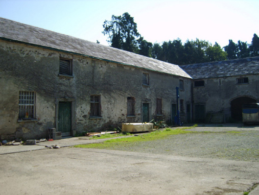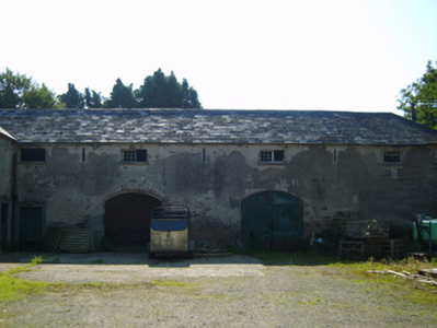 Farmyard complex, extant 1840, on an L-shaped plan about a courtyard including (north): Attached four-bay single-storey stable outbuilding with half-attic on a rectangular plan. Now disused. Hipped and pitched slate roof with clay or terracotta ridge tiles, and no rainwater goods surviving on slate flagged eaves. Part creeper- or ivy-covered fine roughcast walls over coursed or snecked rubble stone construction. Square-headed door openings with cut-granite thresholds, and cut-granite surrounds centred on fluted keystones framing timber boarded doors. Square-headed flanking window openings with cut-granite sills, and concealed red brick block-and-start surrounds framing timber pivot fittings having square glazing bars. Square-headed openings (half-attic) with cut-granite sills, and concealed red brick block-and-start surrounds framing louvered timber fittings; (east): Attached three-bay single-storey coach house with half-attic on a rectangular plan. Now disused. Pitched and hipped slate roof with clay or terracotta ridge tiles, and no rainwater goods surviving on slate flagged eaves. Fine roughcast walls over coursed or snecked rubble stone construction. Series of three segmental-headed carriageways with concealed red brick block-and-start surrounds having stepped reveals framing double doors having overpanels. Square-headed window openings (half-attic) with cut-granite sills, and concealed red brick block-and-start surrounds framing timber fittings having square glazing bars. Set in grounds shared with Wilton Castle with piers to perimeter having cut-granite capping supporting wrought iron double gates.