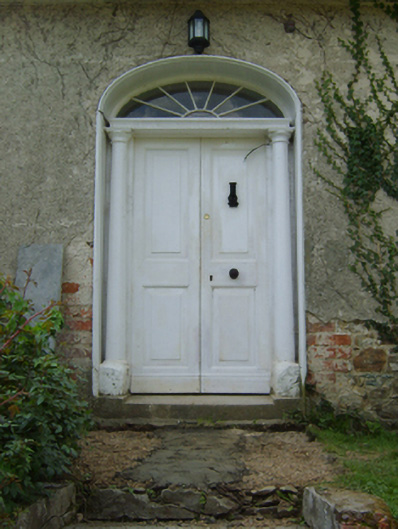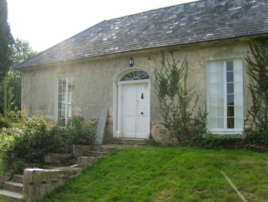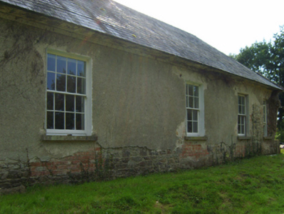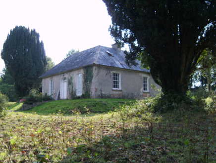 Detached three-bay single-storey house with dormer attic, extant 1853, on a rectangular plan with four-bay single-storey side elevations; three-bay single-storey rear (west) elevation. Vacated, 1998. Derelict, 2004. Undergoing "restoration", 2007. Hipped slate roof on an E-shaped plan with clay or terracotta ridge tiles, cement rendered chimney stacks on axis with ridge having moss-covered concrete capping supporting terracotta pots, rooflights to rear (west) pitch, and no rainwater goods surviving on rendered slate flagged eaves. Part creeper- or ivy-covered fine roughcast walls over coursed rubble stone construction with concealed red brick flush quoins to corners. Segmental-headed central door opening approached by flight of eight cut-granite steps with cut-granite step threshold, doorcase with three quarter-engaged columns on plinths supporting shallow cornice on flush beaded frieze, and moulded rendered surround framing timber panelled double doors having fanlight. Square-headed flanking window openings with cut-granite sills, and concealed red brick block-and-start surrounds framing timber casement windows. Square-headed window openings to side elevations with cut-granite sills, and concealed red brick block-and-start surrounds framing eight-over-eight (east) or six-over-six (remainder) timber sash windows. Round- or segmental-headed central door opening to rear (west) elevation with concealed red brick block-and-start surround framing glazed timber boarded door having fanlight. Interior including central entrance hall undergoing "restoration", 2007; carved timber surrounds to door openings to remainder framing timber panelled doors with timber panelled shutters to window openings. Set in shared grounds.