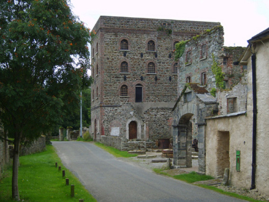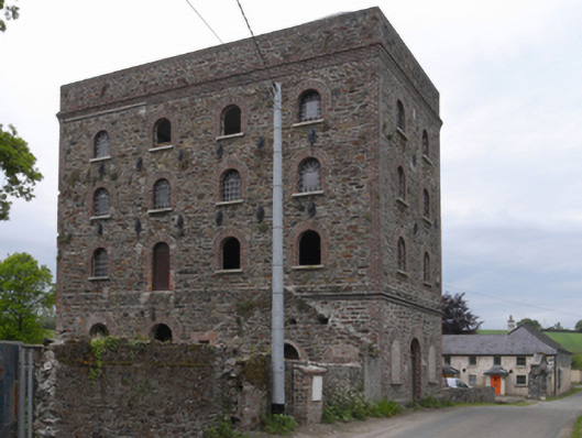 Attached two-bay (three-bay deep) four-storey mill, built 1826, on a rectangular plan originally two-bay (three-bay deep) six-storey. Disused, 1903. Now in ruins. Roof now missing. Part creeper- or ivy-covered tuck pointed snecked rubble stone walls with red brick flush quoins to corners. Square-headed window openings with cut-granite sills, and red brick block-and-start surrounds framing remains of eight-over-eight timber sash windows behind wrought iron bars. Interior in ruins. Set back from line of road in shared grounds.