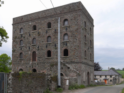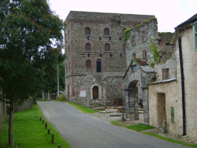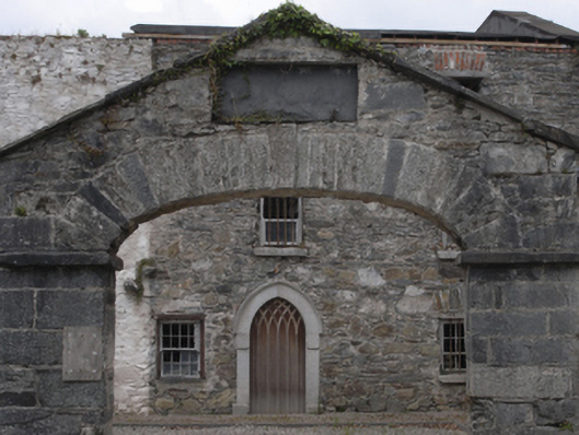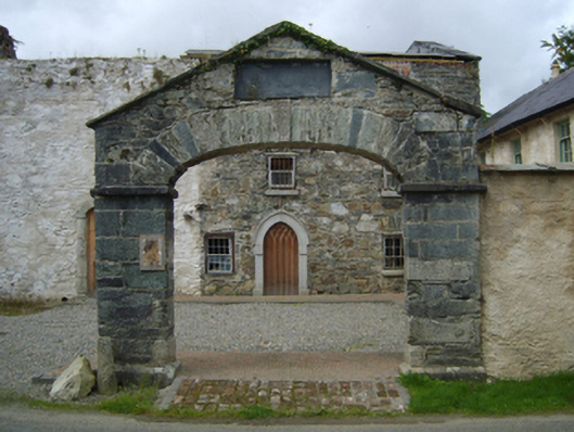 Gateway, extant 1840, on a symmetrical plan with elliptical-headed opening below weathered cut-limestone panel. Road fronted.