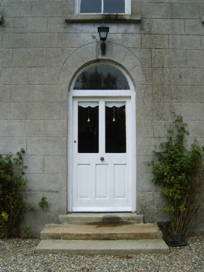 Detached five-bay two-storey farmhouse with half-dormer attic, built 1780; extant 1798, on an L-shaped plan; single-bay (single-bay deep) two-storey return (west). Occupied, 1901. Leased, 1911. Sold 1954. Reroofed, ----. Replacement pitched artificial slate roof; replacement pitched artificial slate roof (west), ridge tiles, concrete or rendered coping to gables with rendered chimney stacks to apexes having stepped capping supporting yellow terracotta tapered pots, central roofline to front (east) pitch, and uPVC rainwater goods on boxed eaves retaining cast-iron downpipes. Rendered, ruled and lined battered wall to front (east) elevation; fine roughcast battered surface finish (remainder). Segmental-headed central door opening with three cut-granite steps, and concealed dressings framing glazed timber panelled door having overlight. Square-headed window openings centred on segmental-headed window opening (first floor) with cut-granite sills, and concealed dressings framing two-over-two timber sash windows having part exposed sash boxes centred on four-over-two timber sash window having part exposed sash box. Square-headed window openings (west) with cut-granite sills, and concealed dressings framing six-over-six timber sash windows having part exposed sash boxes. Interior including (ground floor): central hall retaining carved timber surrounds to door openings framing timber panelled doors, moulded plasterwork cornice to ceiling centred on bas-relief ceiling rose, staircase on a dog leg plan with turned timber "spindle" balusters supporting carved timber banister terminating in volute, carved timber surrounds to door openings to landing framing timber panelled doors, and moulded plasterwork cornice to ceiling; and carved timber surrounds to door openings to remainder framing timber panelled doors with carved timber surrounds to window openings framing timber panelled shutters on panelled risers. Set in landscaped grounds with rendered, ruled and lined piers to perimeter having shallow pyramidal capping supporting wrought iron double gates.