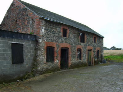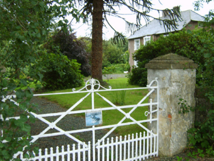 Detached three-bay single-storey farmhouse with half-dormer attic, extant 1903, on a T-shaped plan centred on single-bay full-height breakfront on a shallow segmental bowed plan; two-bay full-height rear (south) elevation. Hipped gabled slate roof with clay ridge tiles, paired rendered red brick Running bond central chimney stacks having stepped capping, and cast-iron rainwater goods on slate flagged eaves retaining cast-iron octagonal or ogee hoppers and downpipes. Part creeper- or ivy-covered roughcast walls on rendered plinth with rendered quoins to corners. Segmental-headed central door opening in segmental-headed recess with flight of three cut-granite steps, carved timber doorcase, and rendered "bas-relief" block-and-start surround centred on keystone having splayed reveals framing timber panelled double doors having fanlight. Camber-headed window opening (half-dormer attic) with cut-granite sill, and rendered "bas-relief" block-and-start surround centred on keystone framing timber casement windows. Square-headed window openings with cut-granite sills, and rendered "bas-relief" block-and-start surrounds framing eight-over-eight (ground floor) or four-over-eight (half-dormer attic) timber sash windows. Interior including (ground floor): central hall retaining carved timber surrounds to door openings framing timber panelled doors, staircase on a dog leg plan with timber balusters supporting carved timber banister terminating in volute, carved timber surrounds to door openings to landing framing timber panelled door, and moulded plasterwork cornice to ceiling centred on plasterwork ceiling rose; and carved timber surrounds to door openings to remainder framing timber panelled doors with timber panelled shutters to window openings. Set in landscaped grounds with rendered red brick Running bond piers to perimeter having pyramidal capping supporting wrought iron-detailed flat iron double gates.
