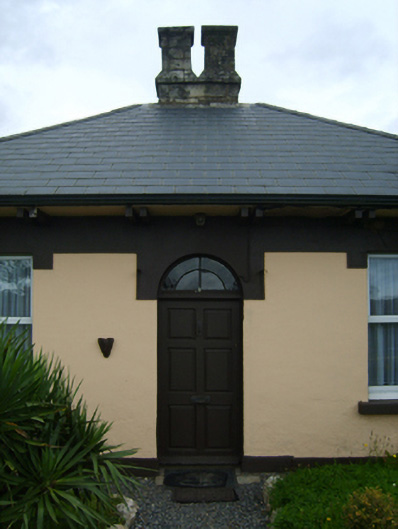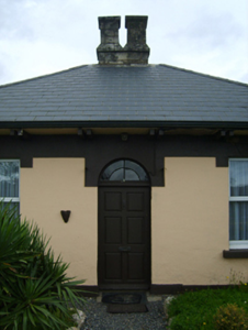 Detached three-bay single-storey gate lodge, extant 1840, on a rectangular plan. Renovated, ----. Replacement hipped artificial slate roof with ridge tiles centred on paired granite ashlar chimney stacks on cut-granite base having cut-granite thumbnail beaded capping, and uPVC rainwater goods on timber eaves boards on slightly overhanging slate flagged eaves having paired timber consoles. Rendered, ruled and lined walls on rendered plinth with rendered band to eaves; lime rendered surface finish to rear (east) elevation. Segmental-headed central door opening with threshold, and concealed dressings framing timber panelled door having overlight. Square-headed window openings including square-headed window openings to rear (east) elevation centred on segmental-headed window opening with cut-granite sills, and concealed dressings framing replacement uPVC casement windows replacing two-over-two timber sash windows with replacement uPVC casement windows to rear (east) elevation centred on fanlight. Set back from line of road opposite entrance to grounds of Edermine House with spear head-detailed wrought iron railings to perimeter centred on spear head-detailed wrought iron gate.