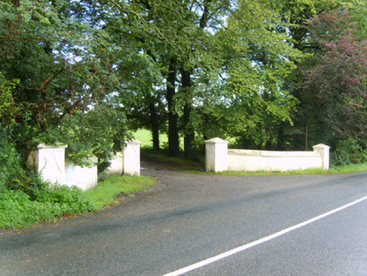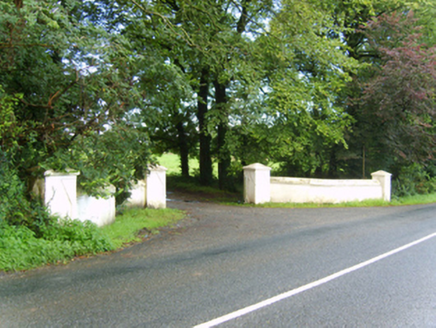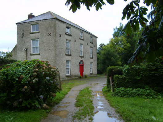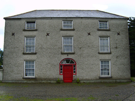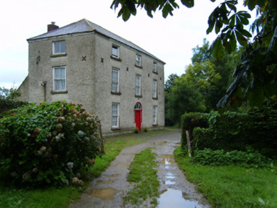 Detached three-bay two-storey farmhouse with half-dormer attic, extant 1798, on a T-shaped plan with single-bay (single-bay deep) full-height central return (west). Occupied, 1911. Sold, 1949. Hipped slate roof on a T-shaped plan centred on hipped slate roof (west) with lichen-covered clay ridge tiles, paired red brick Running bond "wallhead" chimney stacks to rear (west) elevation having corbelled stepped capping supporting terracotta pots, and remains of cast-iron rainwater goods on rendered red brick header bond stepped eaves retaining cast-iron octagonal or ogee hoppers and downpipes. Roughcast walls bellcast over rendered plinth with flat iron cruciform tie bars. Hipped segmental-headed central door opening with timber mullions supporting timber transom, and concealed dressings framing timber panelled door having sidelights below fanlight. Square-headed window openings with cut-granite sills, and concealed dressings framing six-over-six or three-over-three (half-dormer attic) timber sash windows having part exposed sash boxes with two-over-two timber sash windows to side elevations having part exposed sash boxes. Interior including (ground floor): central hall retaining carved timber surrounds to door openings framing timber panelled doors; and carved timber surrounds to door openings to remainder framing timber panelled doors with timber panelled shutters to window openings. Set in landscaped grounds with rendered piers to perimeter having pyramidal capping.