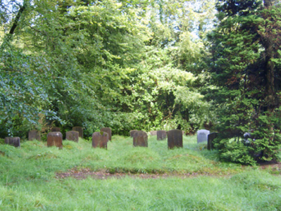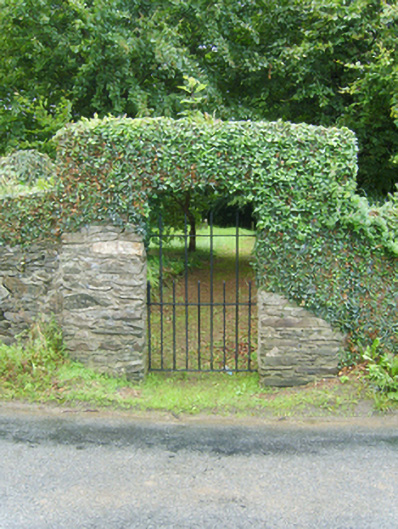 Burial ground, opened 1799. Set in wooded grounds with creeper- or ivy-covered boundary wall to perimeter having overgrown coping centred on square-headed gateway framing wrought iron gate.