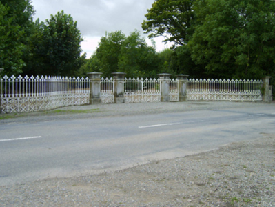 Gateway, extant 1863, on a symmetrical plan comprising paired panelled piers on moulded cushion courses on plinths having paired stringcourses below shallow pyramidal capping supporting cast-iron double gates with benchmark-inscribed outer piers on moulded cushion courses on plinths having paired stringcourses below shallow pyramidal capping supporting cast-iron serpentine railings. Now disused. Road fronted at entrance to grounds of Ballinkeel House.