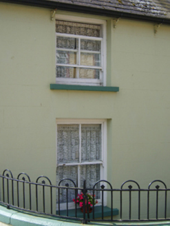 Detached four-bay single-storey house with half-dormer attic, extant 1840, on a rectangular plan originally three-bay single-storey on a symmetrical plan. Extended, ----, producing present composition. Hipped slate roof with clay ridge tiles, rendered central chimney stack having "Cavetto"-detailed capping supporting terracotta pots, and replacement uPVC rainwater goods on rendered eaves. Rendered, ruled and lined walls. Square-headed central door opening with concealed dressings framing timber panelled door. Square-headed window openings with shallow sills, and concealed dressings framing two-over-two timber sash windows. Road fronted on a corner site with looped wrought iron railings to perimeter centred on looped wrought iron gate.