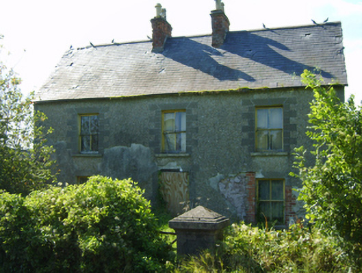 Detached three-bay two-storey farmhouse, extant 1903, on a rectangular plan. Now disused. Pitched slate roof on timber construction with clay ridge tiles centred on paired red brick Running bond chimney stacks having chamfered stringcourses below capping supporting yellow terracotta tapered pots, and remains of cast-iron rainwater goods on rendered red brick header bond eaves. Gritdashed roughcast walls on overgrown plinth with "sparrow pecked" rendered flush quoins to corners. Square-headed central door opening with overgrown threshold, and "sparrow pecked" rendered block-and-start surround with fittings now boarded up. Square-headed window openings with lichen-spotted cut-granite sills, and "sparrow pecked" rendered block-and-start surrounds framing two-over-two timber sash windows. Interior including (ground floor): central hall retaining timber surrounds to door openings framing timber panelled doors; and timber surrounds to door openings to remainder framing timber panelled doors with timber panelled shutters to window openings. Set back from line of road in overgrown grounds with roughcast-panelled rendered piers to perimeter having pyramidal capping supporting flat iron gate.