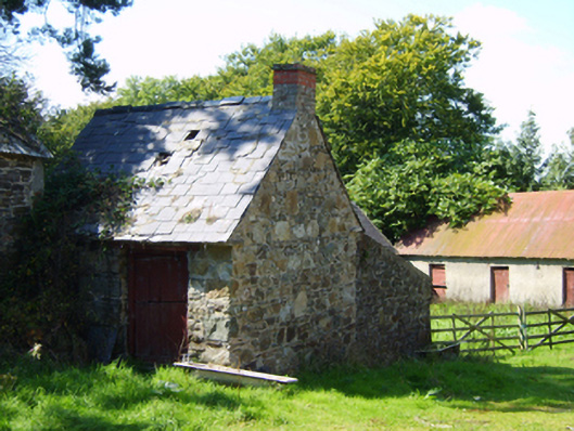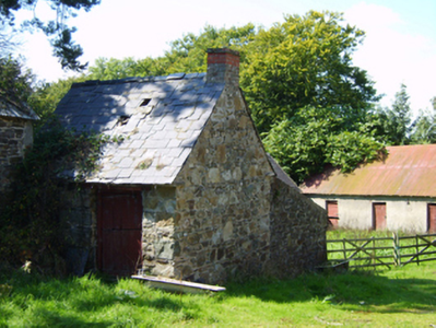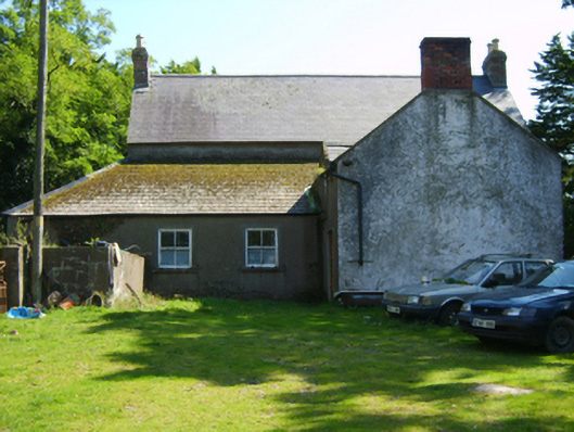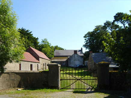 Detached three-bay two-storey farmhouse, extant 1840, on a T-shaped plan centred on single-bay single-storey gabled projecting porch to ground floor. "Improved", pre-1903, producing present composition. Occupied, 1911. Now disused. Pitched slate roofs including pitched (gabled) slate roof (porch), clay ridge tiles terminating in red brick Running bond chimney stacks having corbelled stepped capping supporting yellow terracotta tapered pots, and cast-iron rainwater goods on rendered slate flagged eaves retaining cast-iron downpipes. Fine roughcast battered walls. Square-headed window openings with lichen-spotted sills, and concealed dressings framing three-over-three (ground floor) or two-over-two (first floor) timber sash windows centred on two-over-two timber sash window (ground floor). Set in unkempt grounds with rendered piers to perimeter having moss-covered shallow pyramidal capping supporting flat iron "farm gate".