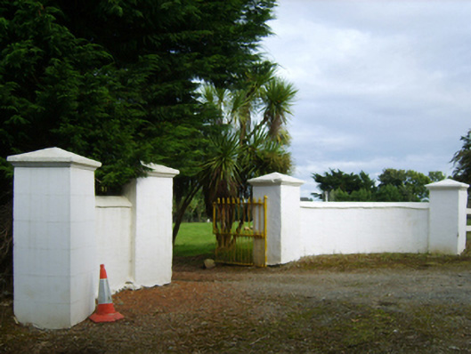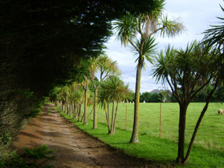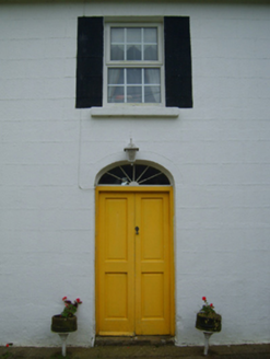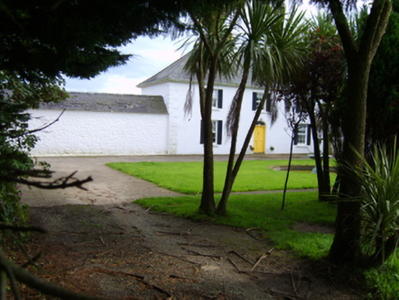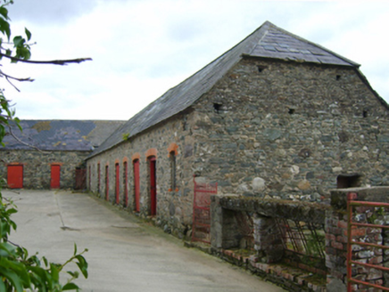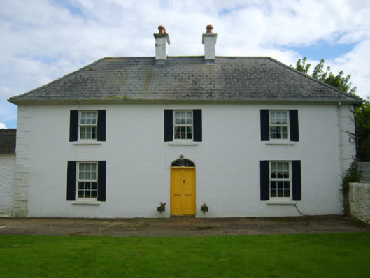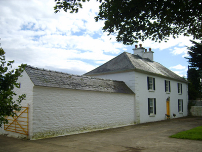 Detached three-bay two-storey farmhouse, dated 1781, on a rectangular plan. Occupied, 1911. Renovated, ----. Replacement hipped artificial slate roof with ridge tiles, paired cement rendered central chimney stacks having concrete capping supporting terracotta octagonal pots, and uPVC rainwater goods on timber eaves boards on rendered eaves. Rendered, ruled and lined walls with rusticated rendered quoins to corners. Segmental-headed central door opening with cut-granite step threshold, and concealed dressings framing timber panelled double doors having fanlight. Square-headed window openings with cut-granite sills, and concealed dressings framing replacement uPVC casement windows replacing six-over-six timber sash windows. Set in landscaped grounds with rendered, ruled and lined piers to perimeter having "Cavetto"-detailed shallow pyramidal capping supporting cast-iron double gates.
