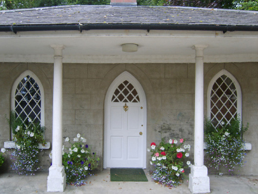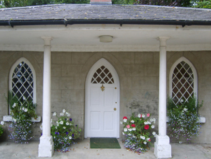 Detached three-bay single-storey gate lodge, extant 1840, on an L-shaped plan with single-bay (south) or two-bay (north) single-storey side elevations. Hipped slate roof on an L-shaped plan with clay ridge tiles centred on replacement red brick Running bond chimney stack having corbelled stepped capping supporting terracotta pots, and cast-iron rainwater goods to front (east) elevation on slightly overhanging rendered eaves on cast-iron pillars on cut-granite stepped plinths with cast-iron rainwater goods (remainder) on slightly overhanging eaves retaining cast-iron downpipes. Rendered, ruled and lined walls. Pointed-arch central door opening with concealed dressings framing glazed timber panelled door. Pointed-arch flanking window openings with cut-granite sills, and concealed dressings framing timber casement windows having lattice glazing bars. Pointed-arch window openings (remainder) with cut-granite sills, and concealed dressings framing timber casement windows having lattice glazing bars. Set back from line of road at entrance to grounds of Rosemount House.
