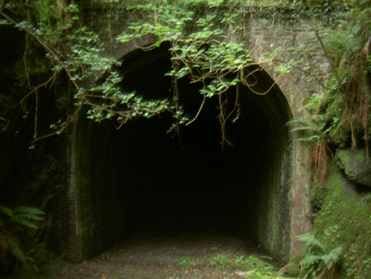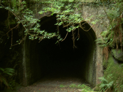 Tunnel, built 1885-7; opened 1887. Closed, 1963. Now disused. Part creeper- or ivy-covered tuck pointed coursed or snecked rubble stone portal walls with overgrown cut-granite coping to parapets. Single horse shoe-profiled openings with red brick block-and-start surrounds. Sited spanning uprooted railway line with unkempt embankments to railway line.