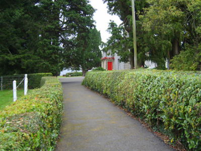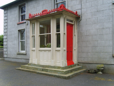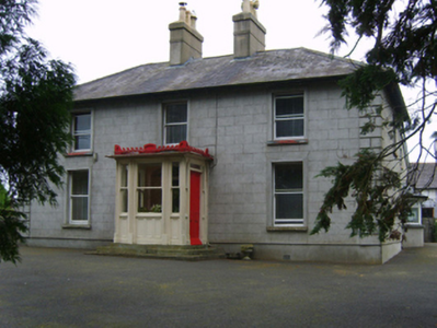 Detached three-bay two-storey farmhouse, extant 1840, on a T-shaped plan centred on single-bay single-storey flat-roofed projecting porch to ground floor. "Improved", pre-1902, producing present composition. Sold, 1910. Occupied, 1911. Renovated, ----. Hipped slate roof with clay ridge tiles, paired rendered central chimney stacks having stringcourses below capping supporting yellow terracotta octagonal or tapered pots, and replacement uPVC rainwater goods on timber eaves boards. Replacement cement rendered, ruled and lined walls bellcast over rendered plinth with rusticated rendered piers to corners. Elliptical- or segmental-headed central door opening into farmhouse with concealed dressings framing timber panelled door having sidelights below fanlight. Square-headed window openings with cut-granite sills, and cement rendered "bas-relief" surrounds framing one-over-one timber sash windows. Interior including (ground floor): central hall retaining carved timber surrounds to door openings framing timber panelled doors; and carved timber surrounds to door openings to remainder framing timber panelled doors with timber panelled shutters to window openings. Set in landscaped grounds