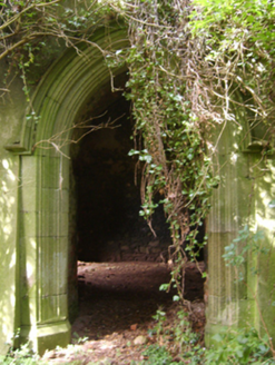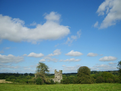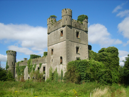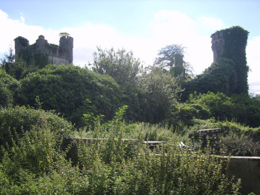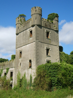 Detached eleven-bay two-storey country house, extant 1863, on an L-shaped plan centred on single-bay four-stage tower on a square plan with single-bay single-storey projecting porch to ground floor; seven-bay (north) or three-bay (east) two-storey wings abutting single-bay full-height turrets on circular plans. Occupied, 1911. In alternative use, 1916-20. In alternative use, 1925. Vacant, 1925-44. Sold, 1944. Dismantled, 1945. Resold, 1965. Pitched roofs now missing, paired rendered diagonal chimney stacks having corbelled stepped capping, and concealed rainwater goods retaining cast-iron octagonal or ogee hoppers and downpipes. Part creeper- or ivy-covered rendered, ruled and lined walls (tower) on battered base with rusticated rendered quoins to corners supporting "arrow loop"-detailed battlemented bartizans centred on battlemented parapets having lichen-spotted coping; rendered, ruled and lined walls (wings) on overgrown plinths with Irish battlemented parapets having lichen-spotted coping; rendered, ruled and lined walls (turrets) on overgrown plinths with cut-granite battlemented parapets on triple beaded corbels having lichen-spotted coping. Square-headed window openings with cut-granite sills, and concealed red brick block-and-start surrounds supporting timber lintels with hood mouldings over. Interior in ruins. Set in overgrown grounds.