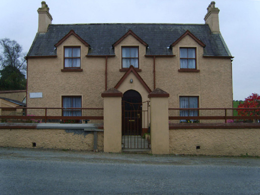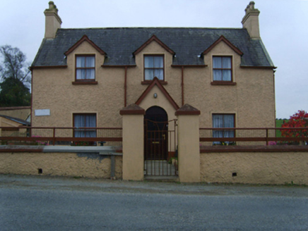 Detached three-bay single-storey constabulary barrack with half-dormer attic, occupied 1901, on a T-shaped plan centred on single-bay single-storey gabled projecting porch. Occupied, 1911. Pitched slate roof including gablets to window openings to half-dormer attic; pitched (gabled) slate roof (porch), lichen-covered clay ridge tiles, concrete or rendered coping to gables with rendered chimney stacks to apexes having corbelled stepped capping supporting yellow terracotta octagonal pots, timber bargeboards to gablets, and cast-iron rainwater goods on roughcast eaves retaining cast-iron ogee hoppers and downpipes. Roughcast wall to front (east) elevation; rendered, ruled and lined surface finish (remainder). Segmental-headed central door opening with concealed dressings framing replacement glazed uPVC panelled door having overpanel. Square-headed window openings with cut-granite sills, and rendered "bas-relief" surrounds framing two-over-two timber sash windows. Set in landscaped grounds on a corner site with rendered piers to perimeter having pyramidal capping supporting iron gate.