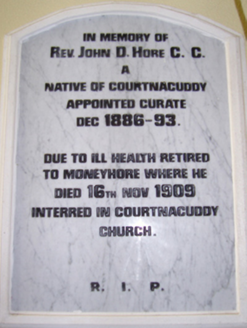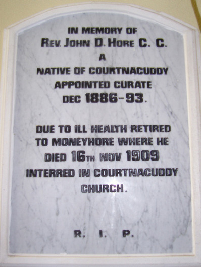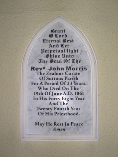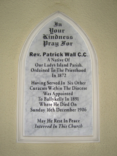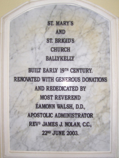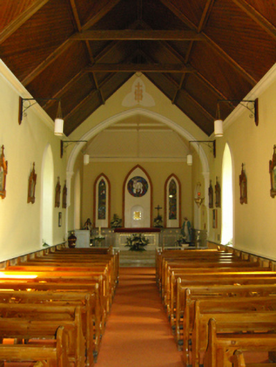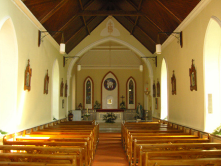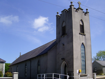 Detached four-bay double-height single-cell Catholic church, extant 1816, on a rectangular plan with single-bay two-stage tower to entrance (west) front on a square plan. Renovated, 1932, with sanctuary "improved". Renovated, ----, with sanctuary reordered. "Restored", 2003. Pitched slate roof with clay ridge tiles terminating in Cross finial to apex (east), rooflights, and replacement uPVC rainwater goods on cement rendered slate flagged eaves. Replacement cement rendered battered walls on rendered chamfered plinth; replacement cement rendered surface finish to tower with crow stepped battlemented parapets having ball finial-topped cut-granite coping. Lancet window openings with cut-granite sills, and concealed dressings framing storm glazing over fixed-pane fittings having stained glass margins centred on leaded stained glass roundels. Lancet window opening to tower (first stage) with cut-granite sill, and concealed dressings framing storm glazing over fixed-pane fitting having stained glass margins centred on leaded stained glass roundels. Lancet openings (bell stage) with cut-granite sills, and concealed dressings framing louvered fittings. Interior including vestibule (west) with stained glass memorial window (undated); pointed-arch door opening into nave with rendered surround framing replacement glazed timber double doors having overlight; full-height interior open into roof with pair of cut-veined white marble Gothic-style wall monuments (ob. 1861; 1906), carpeted central aisle between timber pews, paired Gothic-style timber stations between stained glass windows (undated), exposed collared timber roof construction with wind braced diagonal timber boarded ceiling on moulded plasterwork cornice, and Tudor-headed chancel arch framing cut-veined marble stepped dais to sanctuary (east) reordered, ----, with cut-veined marble panelled altar (1932). Set in relandscaped grounds.
