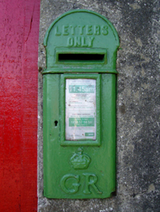 A "lamp box" post box supplied by A. [Andrew] Handyside and Company (established 1848) of Derby and London representing an interesting example of mass-produced cast-iron work making a pleasing, if largely inconspicuous visual statement in a rural street scene with embellishments identifying the artistic potential of the composition including the King George V (1865-1936; r. 1910-22) royal cipher of additional significance as an imprinted reminder of the period when Ireland formed part of the British Empire.