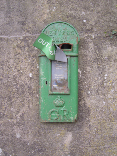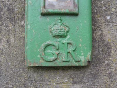 Wall-mounted cast-iron "lamp box" post box, between 1910-22; extant 1922, with "GR [Georgius Rex]" royal cipher. Now disused. Set in rendered wall.