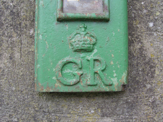 A "lamp box" post box supplied by A. [Andrew] Handyside and Company (established 1848) of Derby and London representing an interesting example of mass-produced cast-iron work making a pleasing, if largely inconspicuous visual statement in a rural street scene with embellishments identifying the artistic potential of the composition including the King George V (1865-1936; r. 1910-22) royal cipher of additional significance as an imprinted reminder of the period when Ireland formed part of the British Empire.