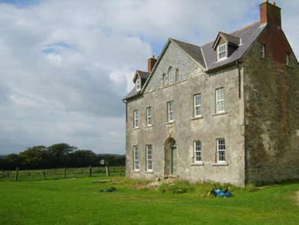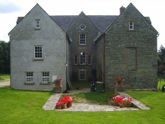 Detached five-bay two-storey farmhouse with dormer attic, built 1746; extant 1755, on a U-shaped plan with pair of single-bay (three-bay deep) full-height returns (north) centred on single-bay (single-bay deep) full-height central return. Occupied, 1911. Vacated, 1934. In ruins, 1940. Sold, 1965. Resold, 2000. Undergoing "restoration", 2007. Replacement pitched slate roof on a U-shaped plan including gablets to window openings to dormer attic centred on pitched (gabled) slate roof, terracotta ridge tiles, repointed red brick Running bond chimney stacks having concrete capping supporting terracotta pots, and cast-iron rainwater goods on slate flagged eaves retaining abbreviated cast-iron downpipes. Lime rendered battered wall to front (south) elevation with slate hung surface finish (gable); part repointed coursed rubble stone battered walls (remainder) originally lime rendered with rough hewn rubble stone flush quoins to corners. Segmental-headed central door opening with steps now missing, and concealed red brick block-and-start surround having concave reveals framing timber panelled door having fanlight. Square-headed window openings with cut-granite sills, and concealed red brick block-and-start surrounds framing replacement six-over-six timber sash windows. "Venetian Window" to rear (north) elevation with cut-granite sill, and red brick block-and-start surround framing fixed-pane fitting having fixed-pane sidelights. Square-headed window opening (top floor) with cut-granite sill, and red brick block-and-start surround framing six-over-six timber sash window. Set in relandscaped grounds.