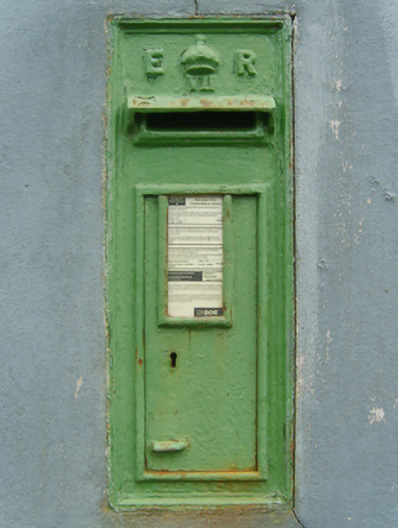 Wall-mounted cast-iron "wall box" post box, between 1905-10, with "ER [Edwardus Rex] VII" royal cipher. Set in rendered wall.