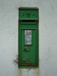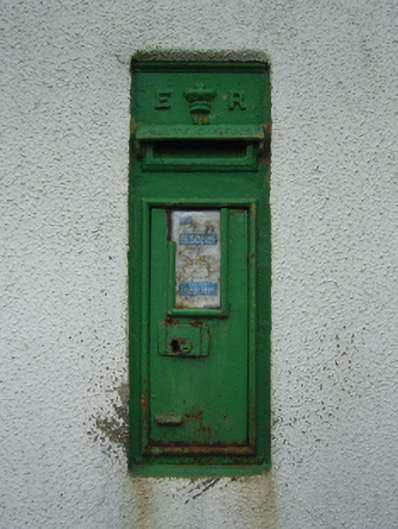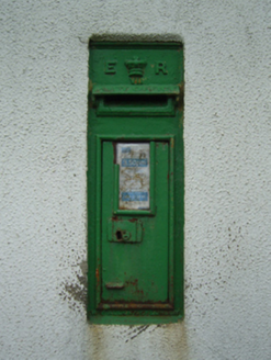Wall-mounted cast-iron "wall box" post box, extant 1903, with "ER [Edwardus Rex] VII" royal cipher. Set in cement rendered wall.