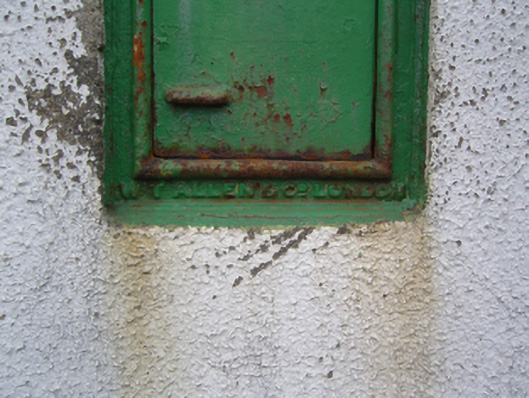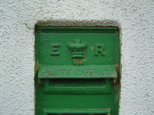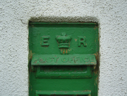 A "wall box" post box supplied by W.T. Allen and Company (fi. 1881-1955) of London representing an interesting example of mass-produced cast-iron work making a pleasing, if largely inconspicuous visual statement in a rural street scene with embellishments identifying the artistic potential of the composition including the King Edward VII (1841-1910; r. 1901-10) royal cipher of additional significance as an imprinted reminder of the period when Ireland formed part of the British Empire.