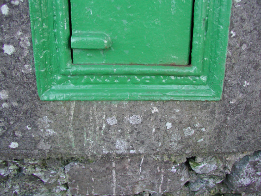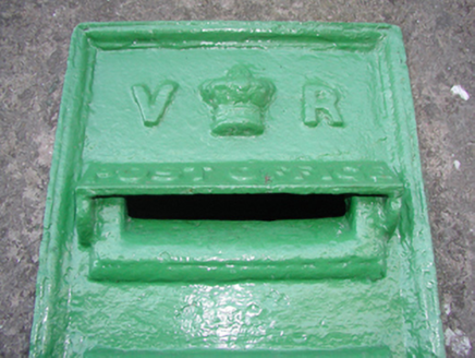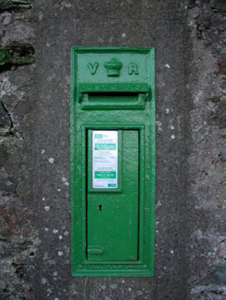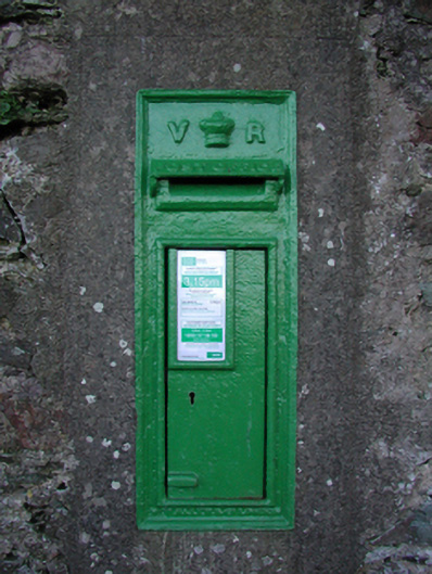 A "wall box" post box supplied by W.T. Allen and Company (fl. 1881-1955) of London representing an interesting example of mass-produced cast-iron work making a pleasing, if largely inconspicuous visual statement in a rural street scene with embellishments identifying the artistic potential of the composition including the Queen Victoria (1819-1901; r. 1837-1901) royal cipher of additional significance as an imprinted reminder of the period when Ireland formed part of the British Empire.