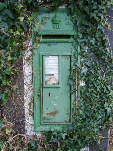 Pier-mounted cast-iron "wall box" post box, between 1905-10; extant 1922, with "ER [Edwardus Rex] VII" royal cipher. Set in ivy-covered roughcast-panelled rendered pier.