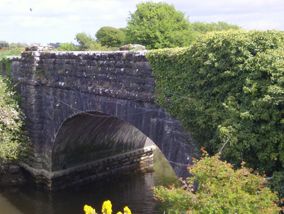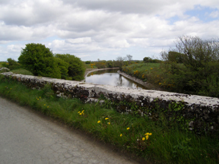 Single-arch road bridge over canal, completed 1853. Part creeper- or ivy-covered tuck pointed rock faced limestone ashlar walls between dragged edged rock faced limestone ashlar piers with rock faced cut-limestone stringcourses supporting benchmark-inscribed parapets having rock faced cut-limestone coping. Single elliptical arch with drag edged rock faced limestone ashlar crow stepped voussoirs centred on drag edged rock faced cut-limestone keystones. Sited spanning Bridgetown Canal with gorse-covered embankments to canal.