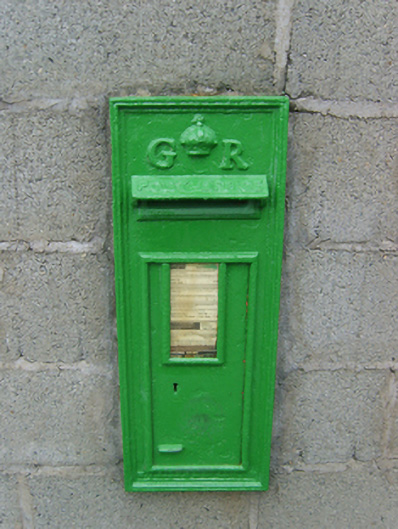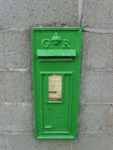 Wall-mounted cast-iron "wall box" post box, extant 1940, with "GR [Georgius Rex]" royal cipher. Set in concrete block wall.
