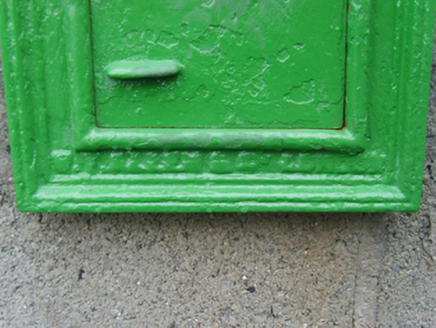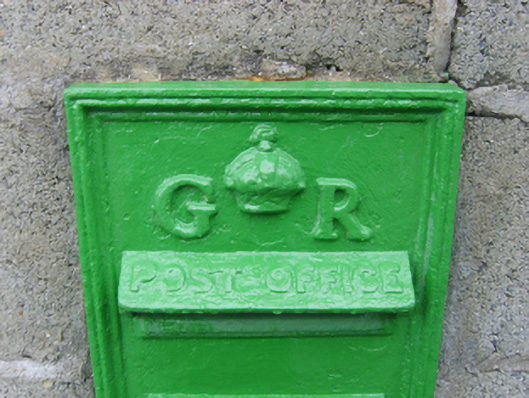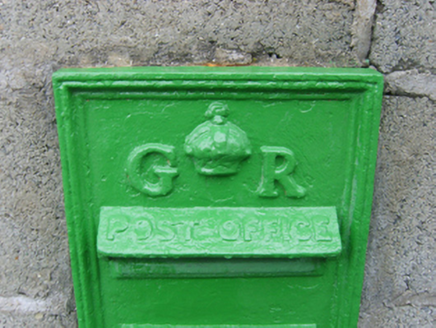 A "wall box" post box supplied by W.T. Allen and Company (fl. 1881-1955) of London representing an interesting example of mass-produced cast-iron work making a pleasing, if largely inconspicuous visual statement in a rural street scene with embellishments identifying the artistic potential of the composition including the King George V (1865-1936; r. 1910-22) royal cipher of additional significance as an imprinted reminder of the period when Ireland formed part of the British Empire.
