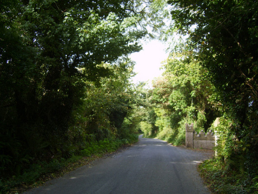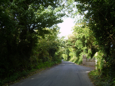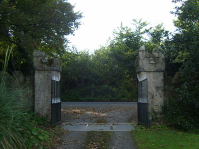 A gateway forming part of a neat self-contained group alongside an opposing ruined gate lodge (see 157047--) with the resulting ensemble not only making a pleasing visual statement in a sylvan street scene at a secondary entrance on to the grounds of the Bargy Castle estate, but also illustrating the continued development or "improvement" of the estate by Major John Harvey (1816-80).
