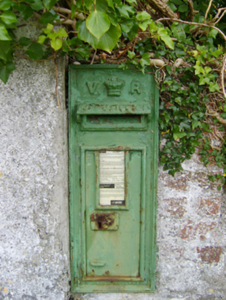 A "wall box" post box supplied by W.T. Allen and Company (fl. 1881-1955) of London representing an interesting example of mass-produced cast-iron work making a pleasing, if largely inconspicuous visual statement in a rural street scene with embellishments identifying the artistic potential of the composition including the Queen Victoria (1819-1901; r. 1837-1901) royal cipher of additional significance as an imprinted reminder of the period when Ireland formed part of the British Empire.