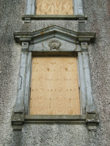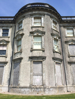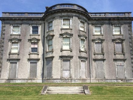 Detached nine-bay three-storey country house, built 1870-1, on an L-shaped plan centred on single-bay single-storey flat-roofed projecting porch to ground floor; seven-bay three-storey side (south) elevation centred on three-bay three-storey breakfront on a bowed plan. Occupied, 1901; 1911. In alternative use, 1916-35. In alternative use, 1937-83. In alternative use, 1983-91. For sale, 1991. Vacant, 2007. For sale, 2008. Roof not visible behind parapet with cast-iron rainwater goods retaining cast-iron downpipes. Roughcast walls on lichen-spotted chamfered cushion course on rendered plinth with lichen-spotted vermiculated-panelled quoins to corners supporting dentilated cornice on blind frieze below balustraded parapet. Square-headed central door opening in tripartite arrangement approached by flight of four steps with engaged columns on panelled pedestals supporting dentilated cornice on "triglyph"-detailed frieze on entablature framing glazed timber panelled double doors having sidelights. Square-headed window openings (ground floor) with lichen-spotted chamfered sill course, and rendered surrounds with bull nose-detailed pilasters supporting "Cyma Recta"- or "Cyma Reversa"-detailed hood mouldings on panelled consoles framing boarded-up one-over-one timber sash windows. Square-headed window openings (first floor) with thumbnail beaded sills, and rendered surrounds with bull nose-detailed pilasters on "Cavetto" consoles supporting "Cyma Recta"- or "Cyma Reversa"-detailed open bed pediments on panelled consoles framing boarded-up one-over-one timber sash windows. Square-headed window openings (top floor) with sills on "Cavetto" consoles, and rendered surrounds with bull nose-detailed pilasters supporting "Cyma Recta"- or "Cyma Reversa"-detailed hood mouldings on panelled consoles framing boarded-up one-over-one timber sash windows. Interior including (ground floor): vestibule; square-headed door opening into hall with carved timber surround having roundel-detailed panelled concave reveals framing glazed timber panelled door having overlight; hall retaining encaustic tiled floor carved timber Classical-style surrounds to door openings framing timber panelled doors centred on cut-veined marble Classical-style chimneypiece with carved timber surrounds to opposing window openings framing timber panelled shutters on panelled risers, and decorative plasterwork cornice to ceiling; top-lit double-height staircase hall (west) retaining inlaid timber parquet floor, timber panelled staircase on an Imperial plan with fluted timber balusters supporting carved timber banisters terminating in timber panelled newels, round-headed niche to half-landing with moulded plasterwork frame, carved timber Classical-style surrounds to door openings to landing framing timber panelled doors, and decorative plasterwork cornice to compartmentalised ceiling centred on stained glass lantern with "Acanthus" ceiling rose; reception room retaining carved timber Classical-style surround to door opening framing timber panelled double doors with carved timber surrounds to window openings framing timber panelled shutters on panelled risers, cut-veined black marble Classical-style chimneypiece with lugged frame centred on keystone, and decorative plasterwork cornice to ceiling centred on "Acanthus" ceiling rose; reception room retaining carved timber Classical-style surround to door opening framing timber panelled double doors with carved timber surrounds to window openings framing timber panelled shutters on panelled risers, cut-veined red marble Classical-style chimneypiece, and decorative plasterwork cornice to ceiling; reception room (south-east) retaining carved timber surround to door opening framing timber panelled door with carved timber surrounds to window openings framing timber panelled shutters on panelled risers, roundel-detailed cut-veined red marble Classical-style chimneypieces, and decorative plasterwork cornice to ceiling; bow-ended reception room (south) retaining carved timber Classical-style surround to door opening framing timber panelled double doors with carved timber surrounds to opposing window openings framing timber panelled shutters on panelled risers, and decorative plasterwork cornice to ceiling; chapel (south-west) retaining inlaid timber parquet floor, cut-veined black marble Classical-style chimneypiece with carved timber surrounds to opposing window openings framing timber panelled shutters on panelled risers, and timber boarded ceiling in carved timber frame on carved timber cornice; and (upper floors): carved timber surrounds to door openings framing timber panelled doors with carved timber surrounds to window openings framing timber panelled shutters on panelled risers. Set in unkempt grounds.