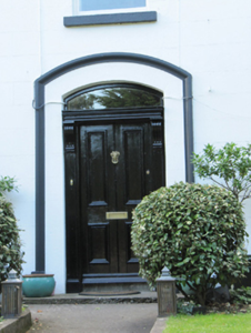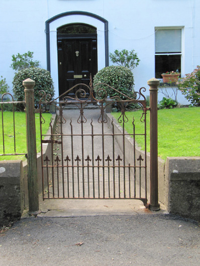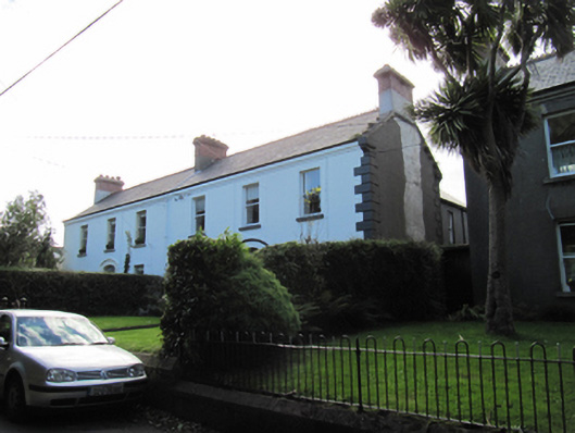 Semi-detached three-bay two-storey Edwardian house, built 1907, with two-storey return to rear (west) elevation, and matching pair to south. Pitched slate roof with terracotta ridge crestings, red brick end chimneystacks with decorative cornices, cast-iron rainwater goods, and painted eaves course. Painted lined-and-ruled rendered walls with render quoins. Square-headed window openings with one-over-one pane timber sliding sash windows and painted granite sills. Segmental-headed door opening with timber panelled door, having timber consoles and lintel with plain overlight, the whole surrounded by moulded render surround. Wrought-iron pedestrian gate, cast-iron piers, wrought-iron railings on rendered plinth with cut granite copings.