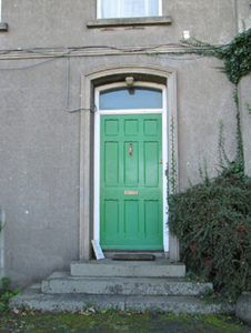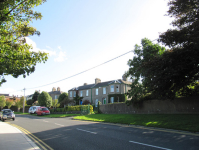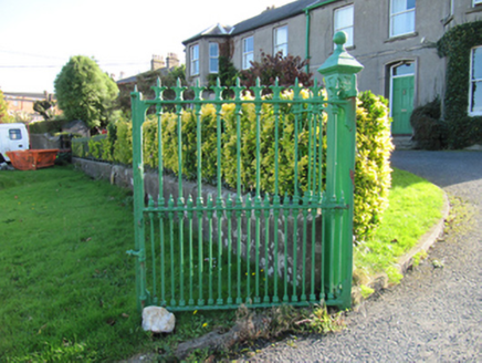 Semi-detached L-plan three-bay two-storey house, built 1898, having full-height canted bay window to front (north) elevation, full-height return to west side of rear elevation, and full-height two-bay flat-roofed projection to re-entrant corner to rear. Matching pair to east. Pitched slate roofs with rendered chimneystacks with collars, cast-iron rainwater goods; hipped slate roof to bay window. Unpainted lined-and-ruled rendered walls with render quoins and render string course. Square-headed window openings, with one-over-one pane timber sliding sash windows. Round-headed stair window to gable elevation, having fixed timber window with margin sashes and coloured lights. Segmental-headed door opening with moulded render surround, with timber panelled door with plain overlight, granite steps and threshold. Set in own grounds, with site entrance having double-leaf wrought- and cast-iron gates, cast-iron piers, and matching railings on rendered plinth walls to east of gate, rendered boundary walls to west.