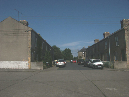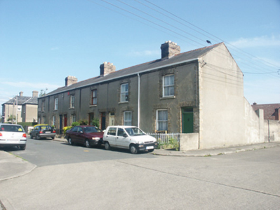 Pair of terraces each comprising six two-bay two-storey houses, built 1908. The houses are constructed in unpainted render with brick dressings. Panelled doors have a plain fanlight and are set within a flat-headed opening; many doors have been replaced with doors of various designs. Window openings are all flat-headed with two-over two timber sash frames; many have been replaced with frames of various designs and materials. The roofs are pitched and finished in slate with part uPVC and part cast-iron rainwater goods; chimneystacks are in facing brick with corbelled caps and clay pots. The houses are within a short cul-de-sac and are slightly set back behind wrought-iron railings.