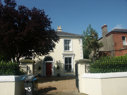 Detached three-bay two-storey house, built c.1865. The house is finished in lined render and moulded quoins. The panelled door is framed with panelled pilasters with console brackets which support a projecting cornice; above is a plain fanlight and all is set within a semi-circular headed opening. The window openings are all flat-headed and have broad moulded surrounds; those to ground floor are surmounted by a projecting cornice supported by console brackets; frames are two over two timber sash. The hipped roof is finished with slate and cast-iron rainwater goods; the eaves are bracketed and rendered chimneystacks have corbelled caps with mixed clay pots. The house is well set back behind a low rubble granite wall with prominent square brick gate pillars and carved stone caps; decorative gates are fabricated in wrought-iron.