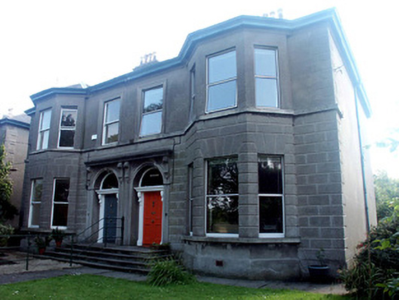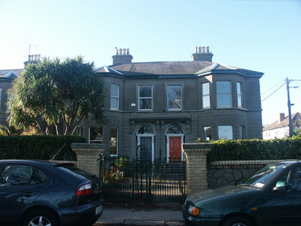 Pair of matching semi-detached two-bay two-storey houses, built c.1880. Each house is finished in lined render, moulded quoins and rusticated ground floor. The panelled door is framed with panelled pilasters with console brackets which support a projecting cornice; above is a plain fanlight and all is set within a semi-circular headed opening; this in turn is framed by larger panelled pilasters which also support a projecting cornice with decorated tympanum; the door arrangement is paired with its neighbour. To one side is a two-storey canted bay with a hipped roof. The window openings are all flat-headed and the house to the south has one over one timber sash frames, while that to the north has one over one top-hung metal replacement frames. The hipped roof is finished with slate and cast-iron rainwater goods; the eaves overhang slightly and rendered chimneystacks have corbelled caps with mixed clay pots. The house is well set back behind a low rubble granite wall with prominent square brick gate pillars and carved stone caps; decorative gates are fabricated in wrought-iron.