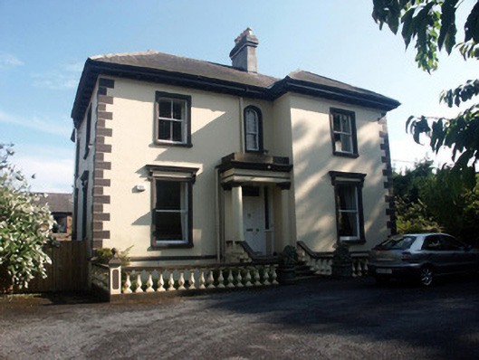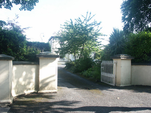 Detached three-bay two-storey over basement house, built c.1880. The house is finished in lined painted render with painted quoins and strung course between basement and ground floor. A short flight of steps rises to the panelled front door which has plain sidelights and fanlight. A projecting flat-roofed porch is supported on plain circular columns and has a cornice and plain blocking course. The balustraded stair handrail continues around to enclose areas either side of the front door. To the west side is a projecting two-storey bay. The window openings are mainly flat-headed and have broad moulded surrounds; those to the ground floor are surmounted by a projecting cornice supported by console brackets with plain frieze; frames are mainly one over one and two over two timber sash. A small window over the first floor has a semi-circular headed opening and has a six over four timber sash frame. The hipped roof is finished with slate and cast-iron rainwater goods; the eaves overhang slightly and the rendered chimneystacks have corbelled caps with tall clay pots. The house is well set back behind a curved and rendered gate screen with square gate pillars with wrought-iron gates.