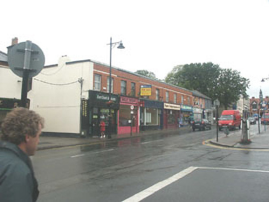 Terrace of five two-bay two-storey shops, built c.1915. The shops are constructed in red brick. Each shop has a replacement shopfront; those three to the south side have a pass door which leads to the first floor apartment while the two to the north have full width shopfronts. The roof is completely hidden behind a high parapet. The shops are all road fronted.