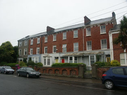 Terraced two-bay three-storey house, built in 1865 as part of a group of five similar properties. The façade is finished in painted render to the ground floor level, with the upper floors in brick. To the ground floor there is a canted bay window. The slated pitched roof has an overhang supported on decorative brackets, and a shared brick chimneystack. The entrance consists of a panelled timber door with pilaster jambs and rectangular fanlight with shaped upper corners. The windows are flat-headed and have one over one and two over two timber sash frames. The bay window shares a single-pitched lead covered roof with the bay window of the neighbouring property. This roof, which is partly supported on timber brackets, has a decorative ‘eaves’ detailing. Cast-iron rainwater goods. The house fronts on to a roadside but is separated from it by a small garden enclosed by a brick wall with arched recesses, rendered coping, and a wrought-iron gate with rendered piers.